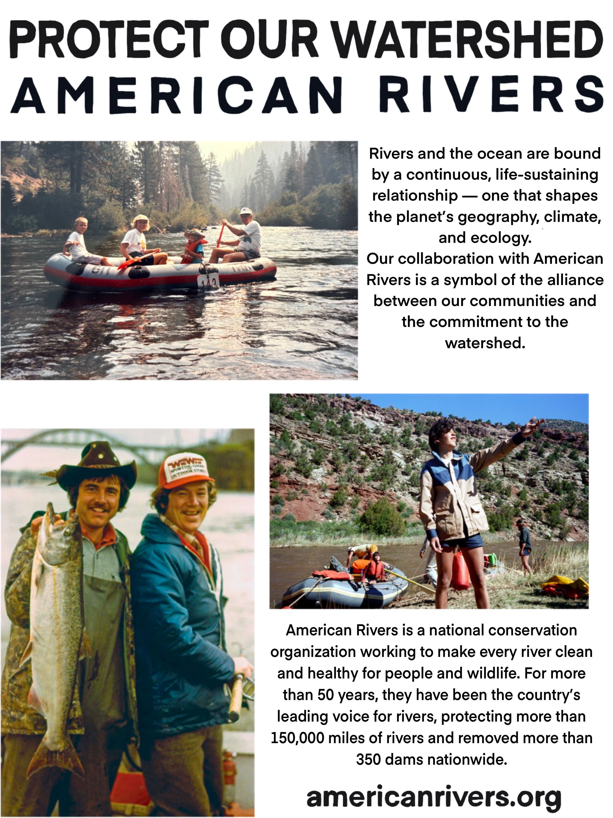 Rivers and the ocean are bound by a continuous, life-sustaining relationship - one that shapes the planet's geography, climate, and the ecology. Our collaboration with American Rivers is a symbol of the alliance between our communities and the commitment to the watershed. visit Americanrivers.org to learn more & support their movment.